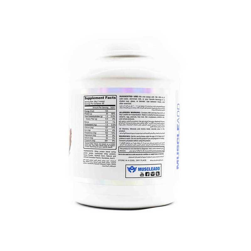 It is a whey protein blend that consists of whey protein isolate and whey protein Hydrolyzed to offer you a strong dose of protein that is free of lactose and gluten and gets quickly absorbed into your muscles to support your protein needs through the day and increase your muscle gains in the shortest time, every serving of Muscle Add Iso Add will support your muscles with 30 grams of protein for your muscles and will give you 135 kilocalories for higher energy and strength through your day, its formula was made to give you a high-quality protein with the support of BCAAs and glutamine for more endurance and recovery after your workout with amazing flavors and easily dissolved in water or milk.