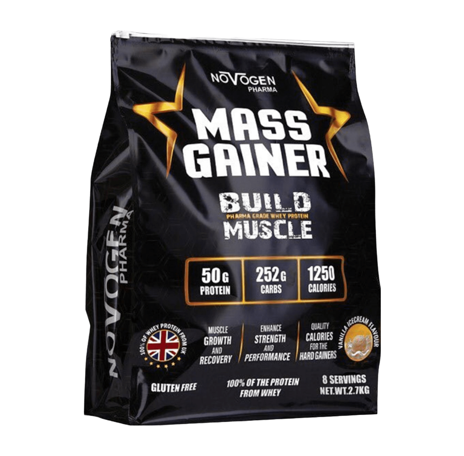 Novogen Pharma Mass Gainer The best formula to reach your weight and muscle mass targets. Each serving contains 50g of high-quality protein that your muscles need to grow and recover, 252g carbohydrates, and 1250 calories which acts as your body’s main energy source to fuel your muscles and the essential multivitamins needed for your overall health.