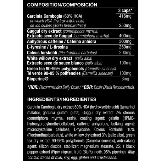 The perfect combination of stimulating active ingredients such as anhydrous caffeine and green tea, with plant extracts and amino acids such as L-tyrosine. Its thermogenic formula has been enriched with other plant extracts such as garcinia cambogia and guggul dry extract. Ideal for athletes in the definition phase!